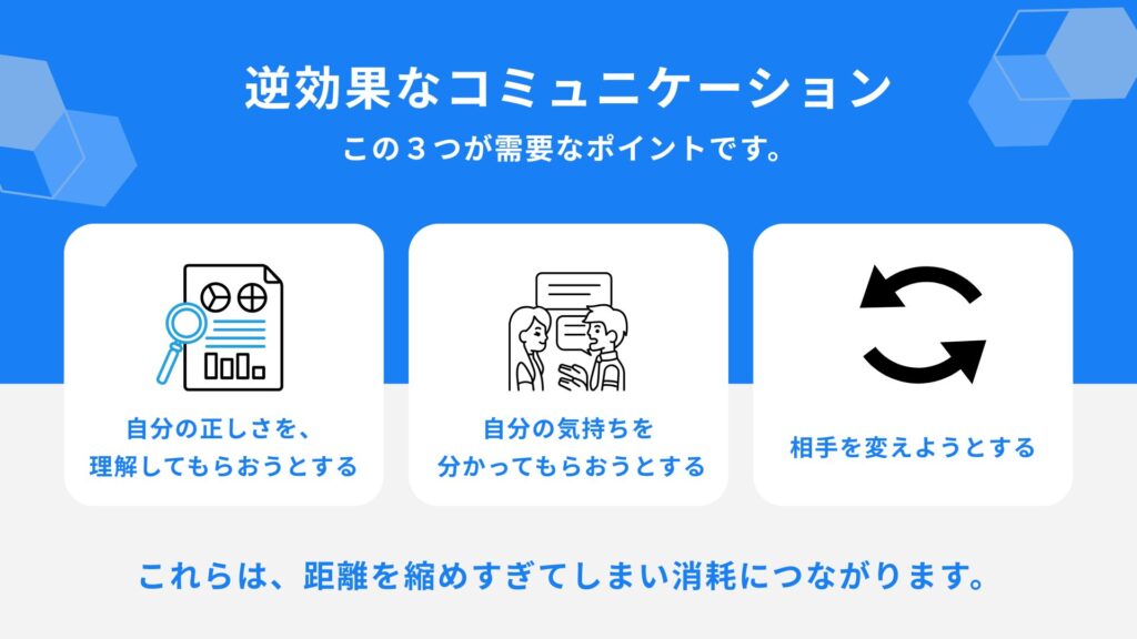 と受け取られ、間違った認識が進み、感情的な消耗が増えていきます。