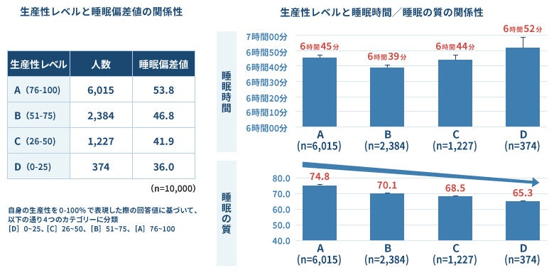 こちらは、PR TIMESが株式会社ブレインスリープと作製した睡眠の質と生産性の関係になりますが、自身の生産性をレベル3(生産性の自己評価が51〜75%)以上と回答した人の睡眠の質のスコアは70点以上、またレベル4(同じく76〜100%)に近付くほど睡眠の質のスコアが上がる事が分かりました。